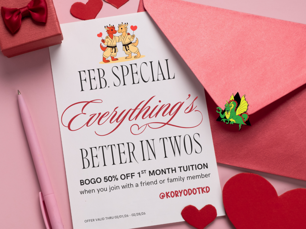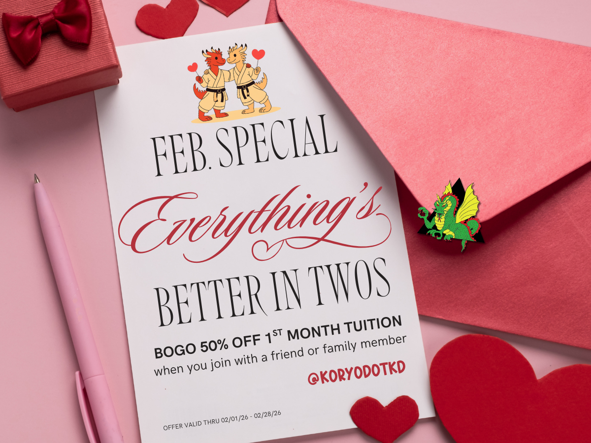Share the love & save on the fun when you take advantage of Koryo Do’s February special! Buy One, Get One 50% off your 1st month’s tuition when you join with a friend or family member!