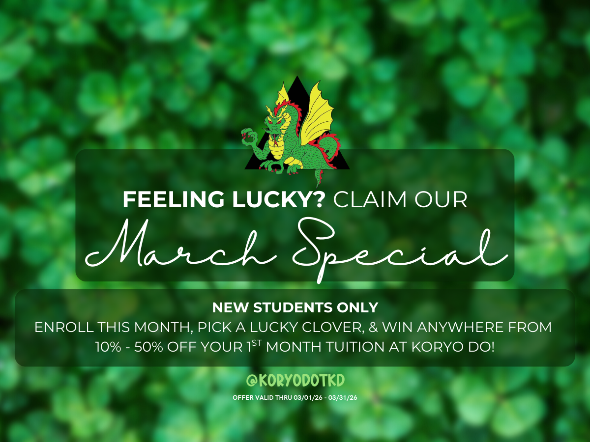 Feeling Lucky? New to Koryo Do? Join after trying your free trial class and pick a clover to save anywhere from 10% – 50% off your first month of tuition with our March 2026 Special!